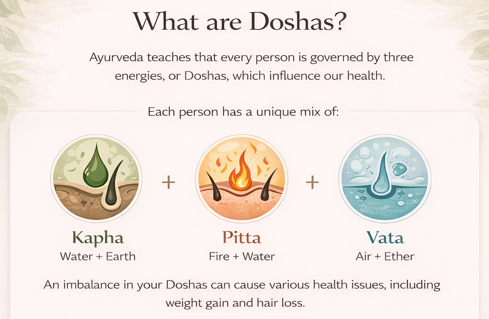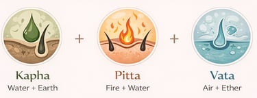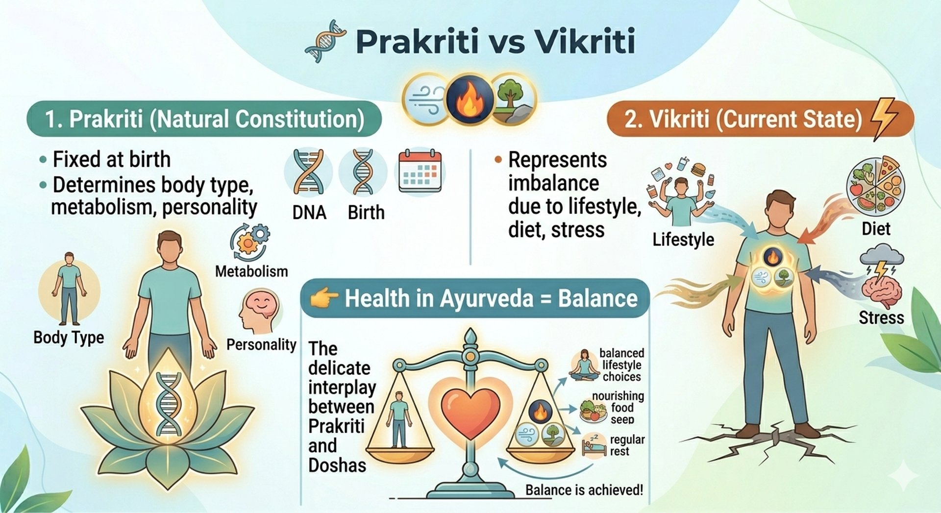 Each individual has a unique constitution (Prakriti) determined by the proportion of these Doshas.