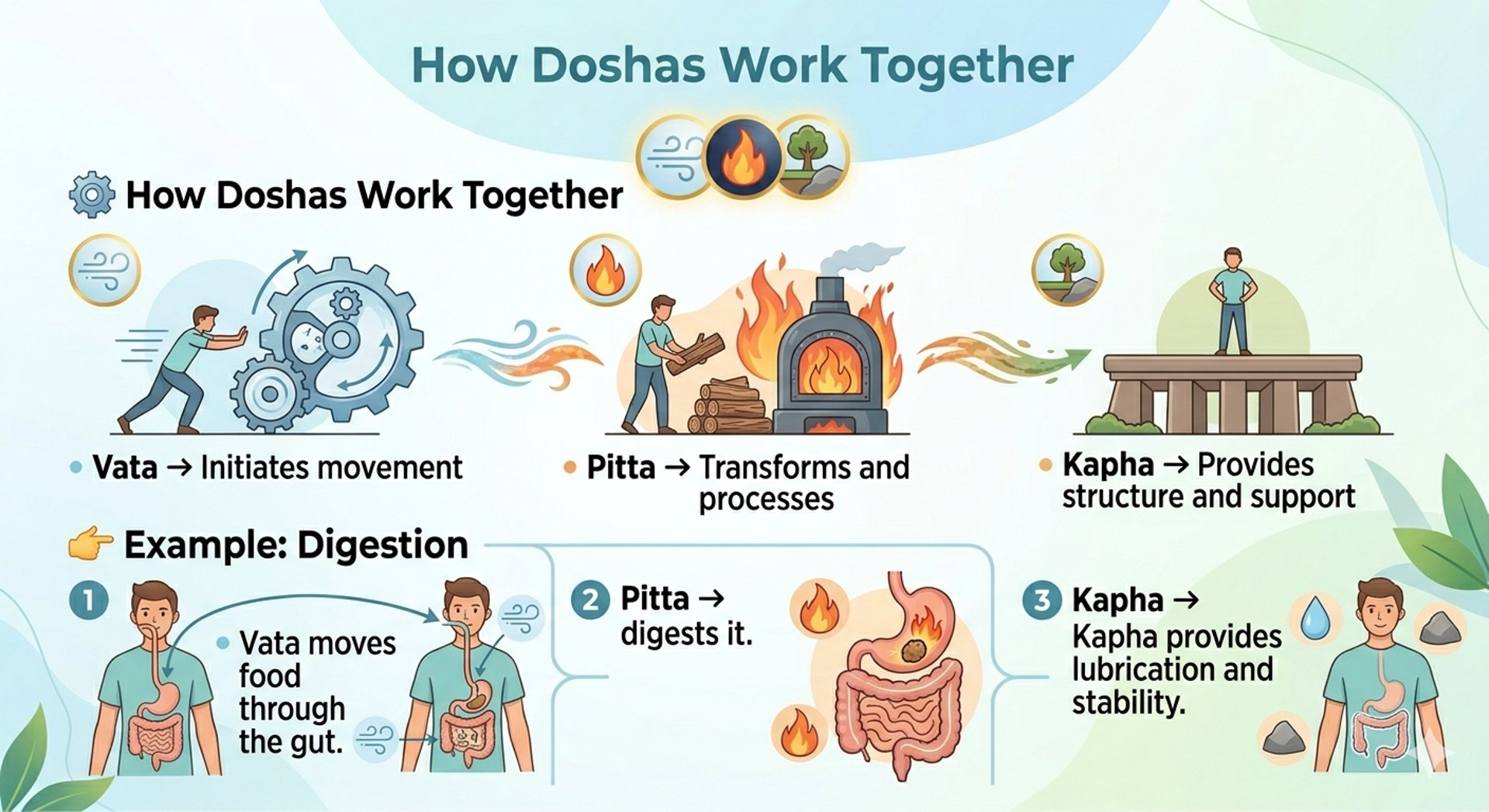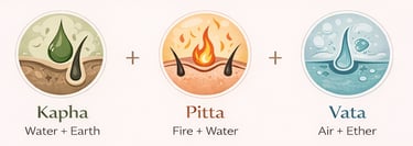 Doshas are functional energies derived from the five great elements (Panchamahabhutas):